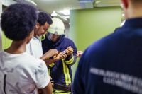 Den Jugendlichen wurde zudem erklärt, wie das Feuerwehrwesen in Deutschland funktioniert. Viele Jugendliche interessierten sich sehr für entsprechende Ausbildungsmöglichkeiten zum Werk- oder Berufsfeuerwehrmann. Nahezu allen war unbekannt, dass Sie sich auch ehrenamtlich in jeder Kommune bei der Feuerwehr engagieren können. Dass ehrenamtliche Feuerwehrleute dabei Tag und Nacht einsatzbereit sind, wollten viele Besucher zunächst nicht recht glauben. Fleißig wurden Uniformen Probegetragen, Ausrüstungsgegenstände erklärt und auch die Handhabung von Feuerlöschern geübt. Insbesondere ein junger Mann war so angetan, dass er sich sogleich nach Kontaktmöglichkeiten erkundigte, um in die Feuerwehr eintreten zu können.