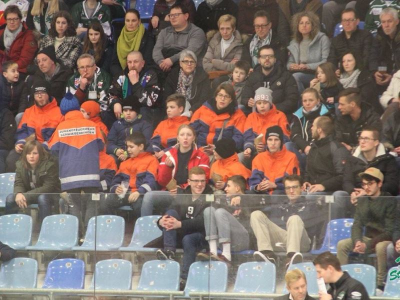 Anlässlich des Tag der Hilfsorganisationen startete die Jugendfeuerwehr Schwieberdingen zu einem Ausflug zum Eishockeyspiel nach Bietigheim. Die Begegnung Steelers gegen die Eispiraten aus Crimmitschau war das Ziel. Ganz aufgeregt trafen wir uns am Freitagabend am Feuerwehrhaus in Schwieberdingen, angezogen mit Parka und Innenfutter starteten wir mit dem Feuerwehrauto in Richtung Bietigheim. Die Feuerwehrautos auf dem Parkplatz zeugten davon, dass noch viele andere der Einladung gefolgt waren.