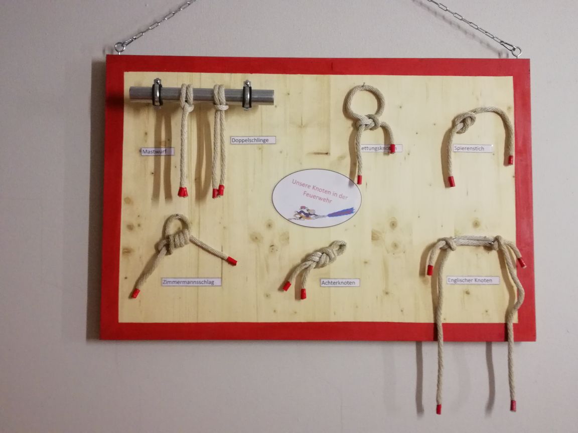 Am vergangenen Donnerstag, den 08.02.2018 stand der Übungsabend ganz unter dem Zeichen der Koten. Anlässlich dessen, haben wir gemeinsam mit den Jugendlich ein Knotenbrett mit allen wichtigen Knoten aus der Feuerwehrdienstvorschrift gebastelt. Knoten haben im Feuerwehrdienst eine große Bedeutung, denn sie können einem im Ernstfall das Leben retten. Zudem müssen die Jugendlichen 3 Knoten für die Abnahme der Jugendflamme beherrschen, diese soll im Sommer abgenommen werden. Damit die Knoten auch wirklich sitzen, fangen die Jugendlich bereits in der Jugendfeuerwehr an die Knoten zu lernen. Diese Begleiten Feuerwehrleute über ihre gesamte Laufbahn bei der Feuerwehr. Damit diese nicht mehr so leicht vergessen werden, haben wir alle wichtigen Knoten von Mastwurf zur Doppelschlinge bis hin zum Rettungsknoten auf einem Brett befestigt, sodass diese immer sichtbar sind und nicht mehr vergessen werden. Damit dies auch der Einsatzabteilung zugutekommt, soll das gebastelte Knotenbrett in der Fahrzeughalle für alle aufgehängt werden.