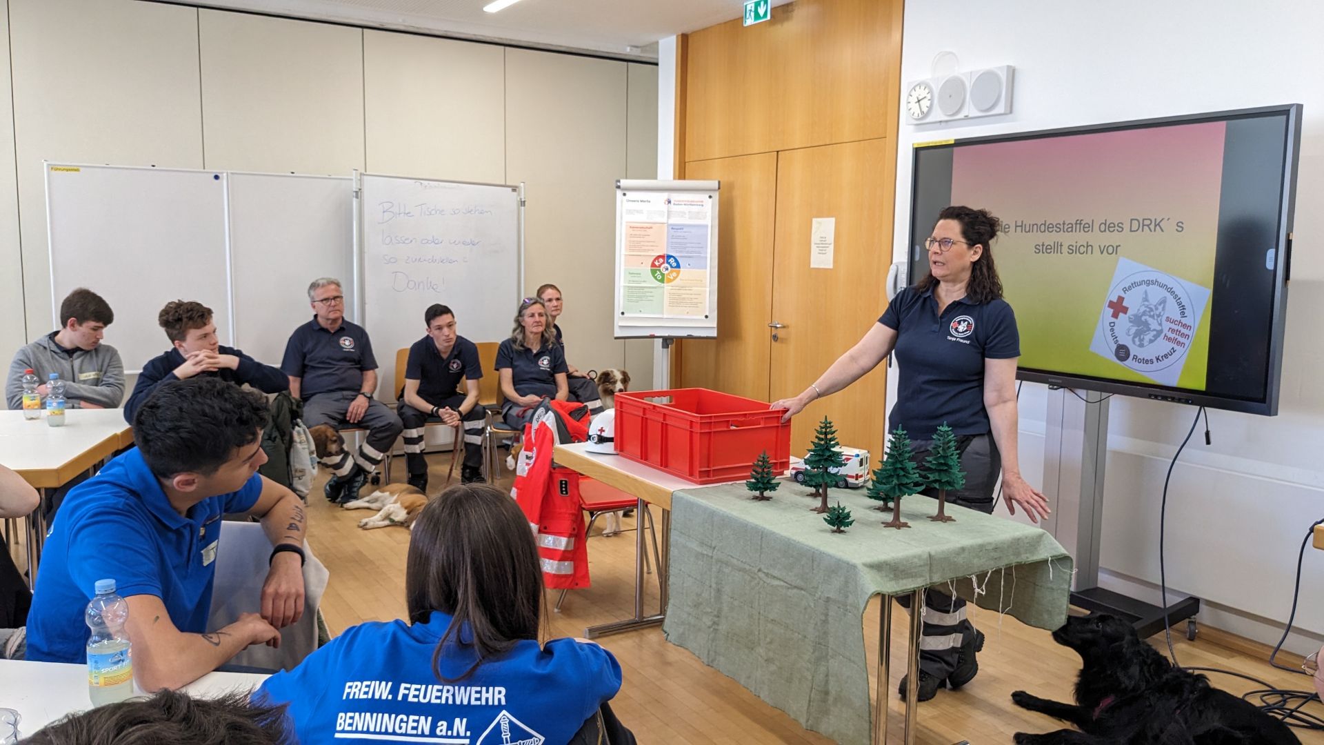 Als letzten Tagespunkt und Hauptprogrammpunkt am Tage besuchte uns die Rettungshundestaffel des DRKs des Landkreises Ludwigsburg. Ein Team mit 6 Einsatzkräften und 6 Rettungshunden erklärte uns die wichtigen Aufgaben dieser Einsatzgruppe, welche unterschiedlichen Rettungshunde es gibt, das Vorgehen bei einer vermissten Person und vieles Spannendes mehr. Im Anschluss durften sich ein paar Jugendliche verstecken, welche dann von den Spürhunden gefunden wurden. So wurden uns mehrere Einsatzszenarien gezeigt, wie die Hunde vermisste Personen suchen und wie die Einsatzgruppe des DRKs arbeitet.